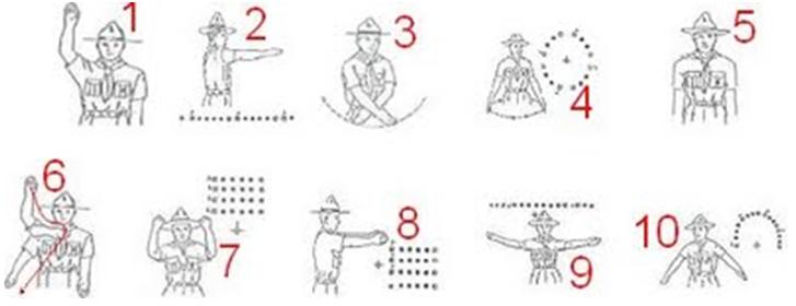8 – FILA POR PATRULHA: É um dos sinais manuais mais utilizados. As patrulhas ficam formadas em filas à frente do Chefe, duas a sua esquerda e duas à sua direita, sendo que todas devem ficar a 3 passos de distância do Chefe.